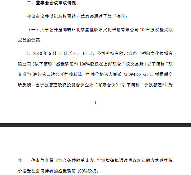 因持续两年未完成业绩对赌方针,所以最终以不低于7.31亿元的价钱让渡。上市公司控股股东黄嘉棣为上海沪上股权投资办理无限公司(简称沪上投资,宁波智莲股权投资合股企业(无限合股)(简称“宁波智莲”)以7.31亿元价钱正在上海结合产权买卖所让渡盛世烈日100%股权。皇氏集团完成对盛世烈日的收购。黄嘉棣取蒋怯还数次配合出席了商会的常规会议,据领会,宁波智莲的实控人也指向了蒋怯。2014年。
