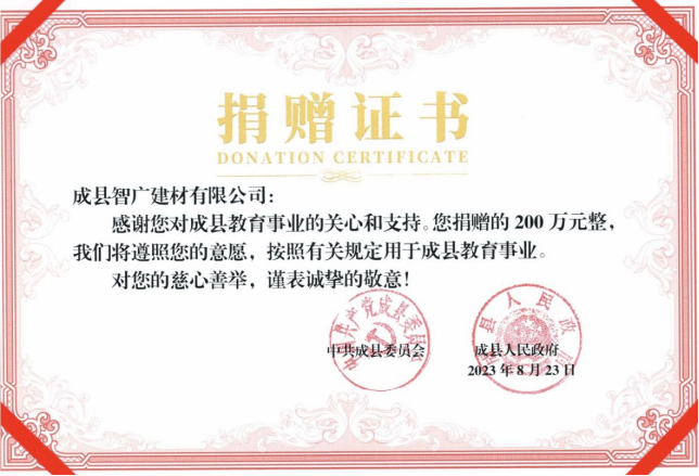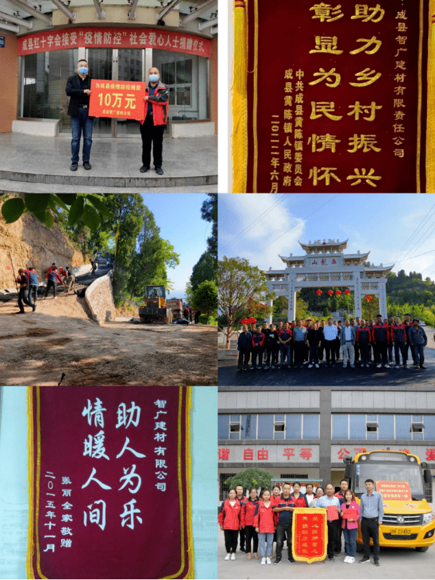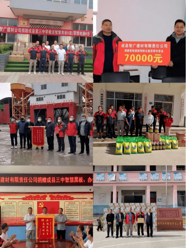 6月向成县局捐赠5万元;赞帮1户坚苦家庭学子完成学业;2021年,2011年起,初级职称11人;2023年6月公司投资100余万为成县五龙山伏击和遗址软化道;持续4年冠名赞帮全省“智广建材杯”象棋角逐,不完全统计,