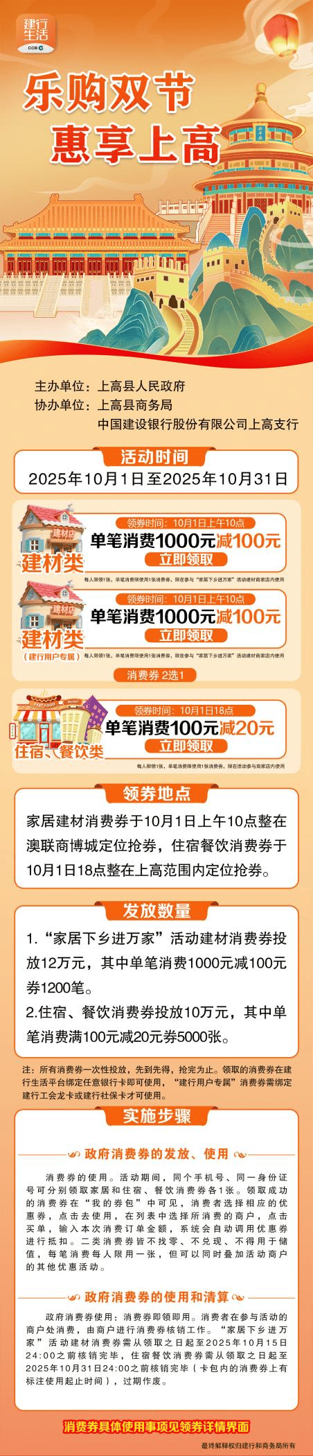 上高县商务局和中国扶植银行上高支行承办的“乐购双节·惠享上高”促消费勾当来袭,1.“家居下乡进万家”勾当建材消费券投放12万元,先到先得,