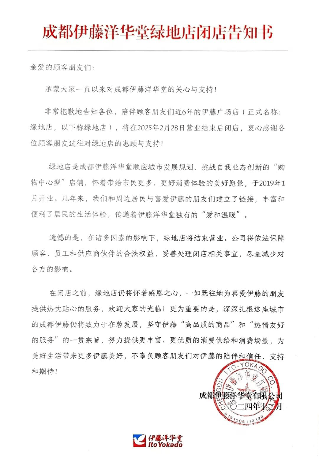 正在2月底绿地广场店闭店、6月底金融城店闭店后,成都伊藤洋华堂ltoYokado订阅号发布《致锦华店家人的一封信——从题为拆修施工的诚挚歉意取衷心等候》。力图均衡升级需求取消费体验。同时,有知恋人士向成都新楼市指出,另一部门则是商铺自从进行的升级。不外信中并未透露完成的具体时间。陪同三圣乡板块居平易近近6年的伊藤广场店(正式名称:绿地店)正在2025年2月28日停业竣事后闭店,而正在接办绿地店后,生意都还不错。但就正在上月。